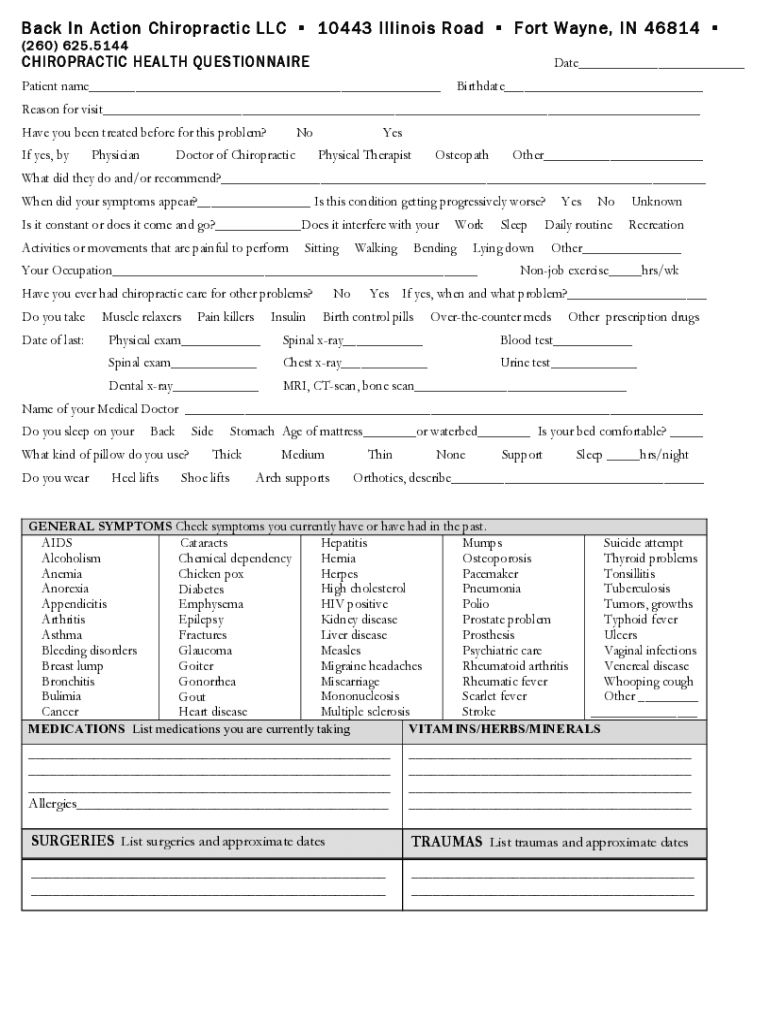 Back In Action Chiropractic LLC 10443 Illinois Road Fort Wayne, IN 46814 (260) 625.5144CHIROPRACTIC HEALTH QUESTIONNAIREDate___Patient name___Birthdate___Reason for visit___ Have you been treated