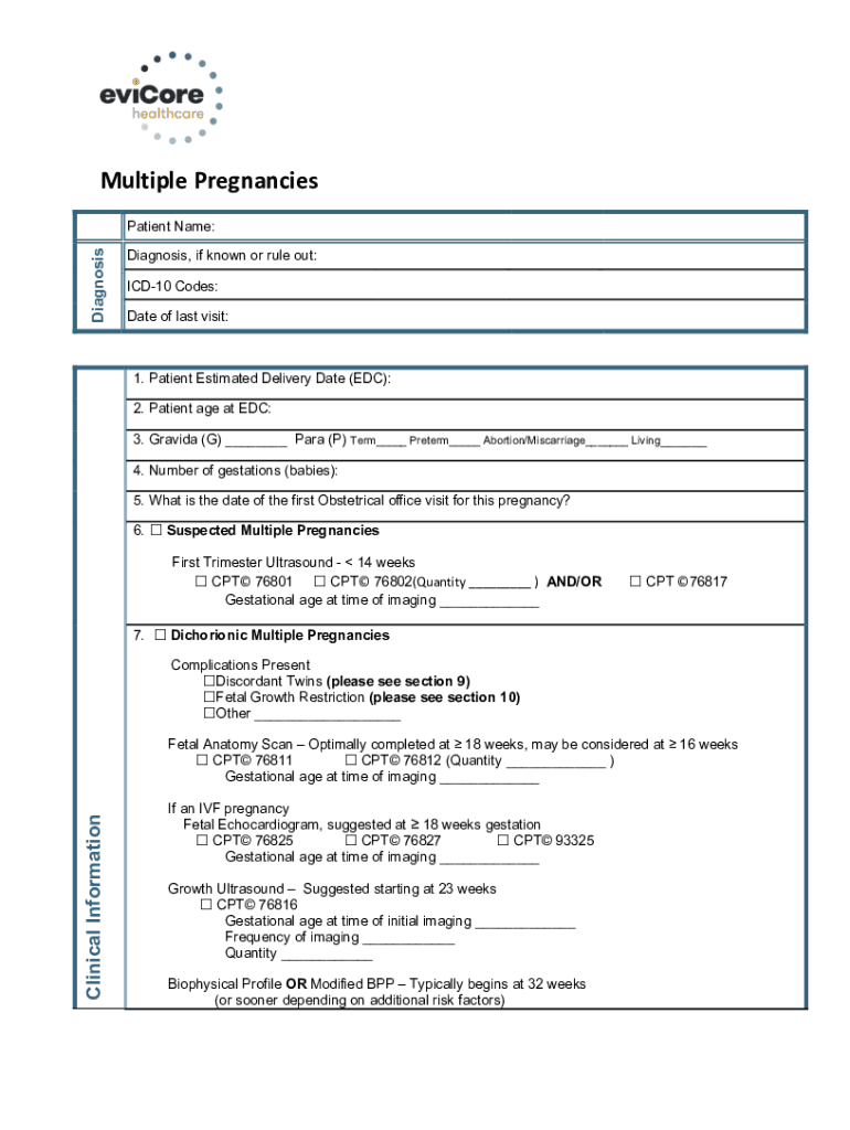 Multiple Pregnancies DiagnosisPatient Name: Diagnosis, if known or rule out: ICD10 Codes: Date of last visit:1. Patient Estimated Delivery Date (EDC): 2. Patient age at EDC: 3. Gravid (G) ___ Para