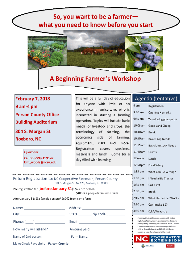 So, you want to be a farmer what you need to know before you start Beginning Farmers Workshop February 7, 2018This will be a full day of education for anyone with little or no experience in agriculture,