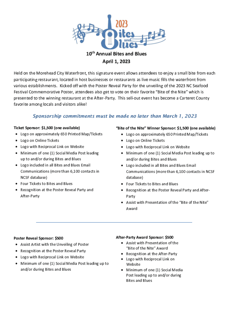 10th Annual Bites and Blues April 1, 2023, Held on the Forehead City Waterfront, this signature event allows attendees to enjoy a small bite from each participating restaurant, located in host businesses