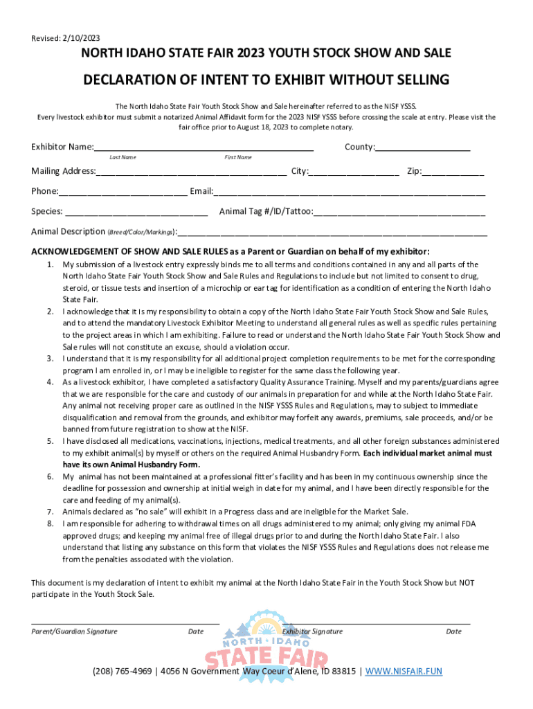 Revised: 2/10/2023NORTH IDAHO STATE FAIR 2023 YOUTH STOCK SHOW AND SALEDECLARATION OF INTENT TO EXHIBIT WITHOUT SELLING