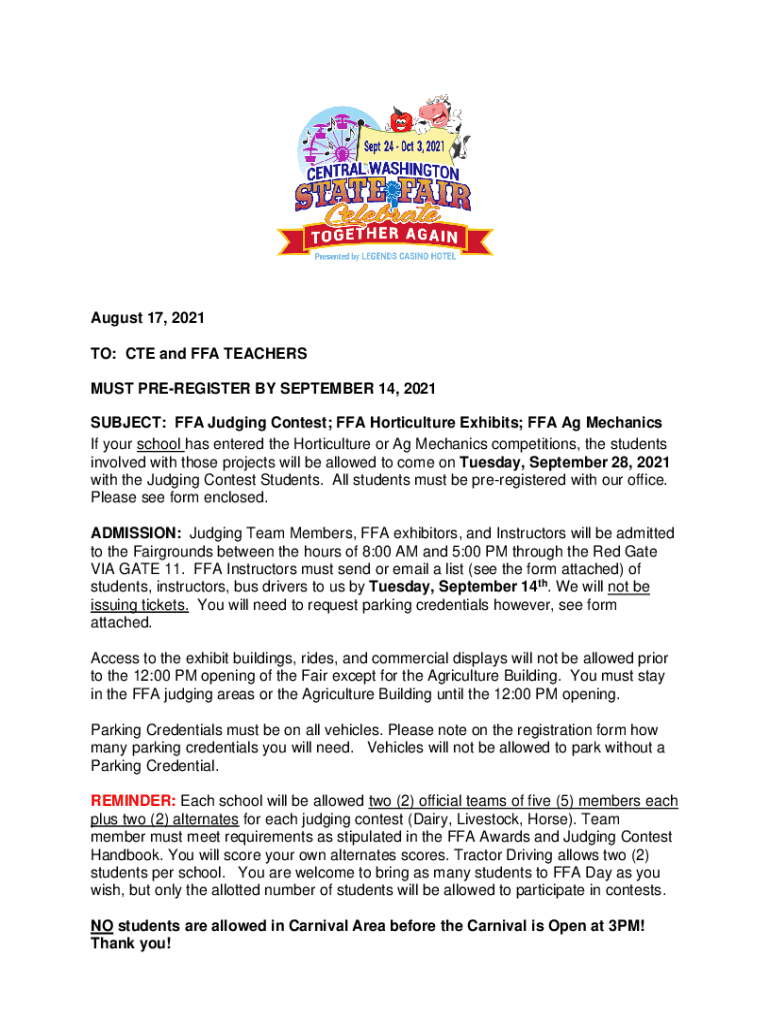 August 17, 2021, TO: CTE and FFA TEACHERS MUST PREREGISTER BY SEPTEMBER 14, 2021, SUBJECT: FFA Judging Contest; FFA Horticulture Exhibits; FFA Ag Mechanics If your school has entered the Horticulture