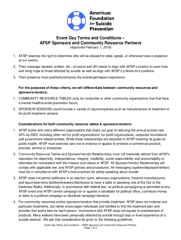 Event Day Terms and Conditions ASP Sponsors and Community Resource Partners (Approved February 1, 2018) 1. ASP reserves the right to determine who will be allowed to table, speak, or otherwise have