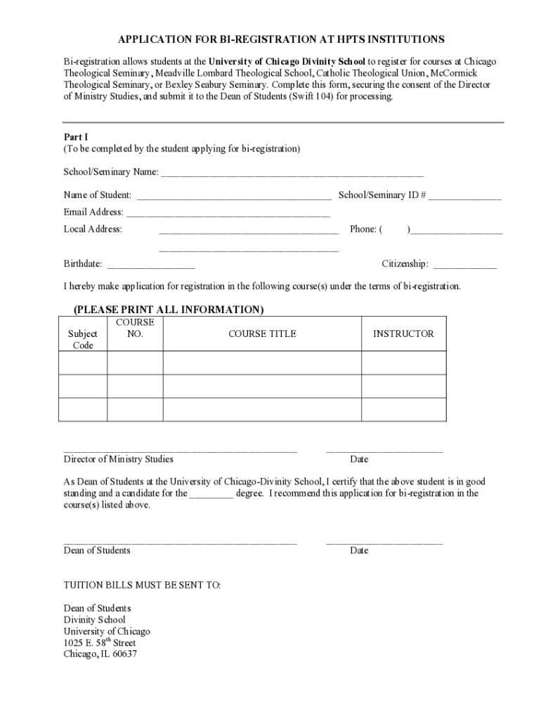APPLICATION FOR REGISTRATION AT HITS INSTITUTIONS Bi registration allows students at the University of Chicago Divinity School to register for courses at Chicago Theological Seminary, Melville Lombard