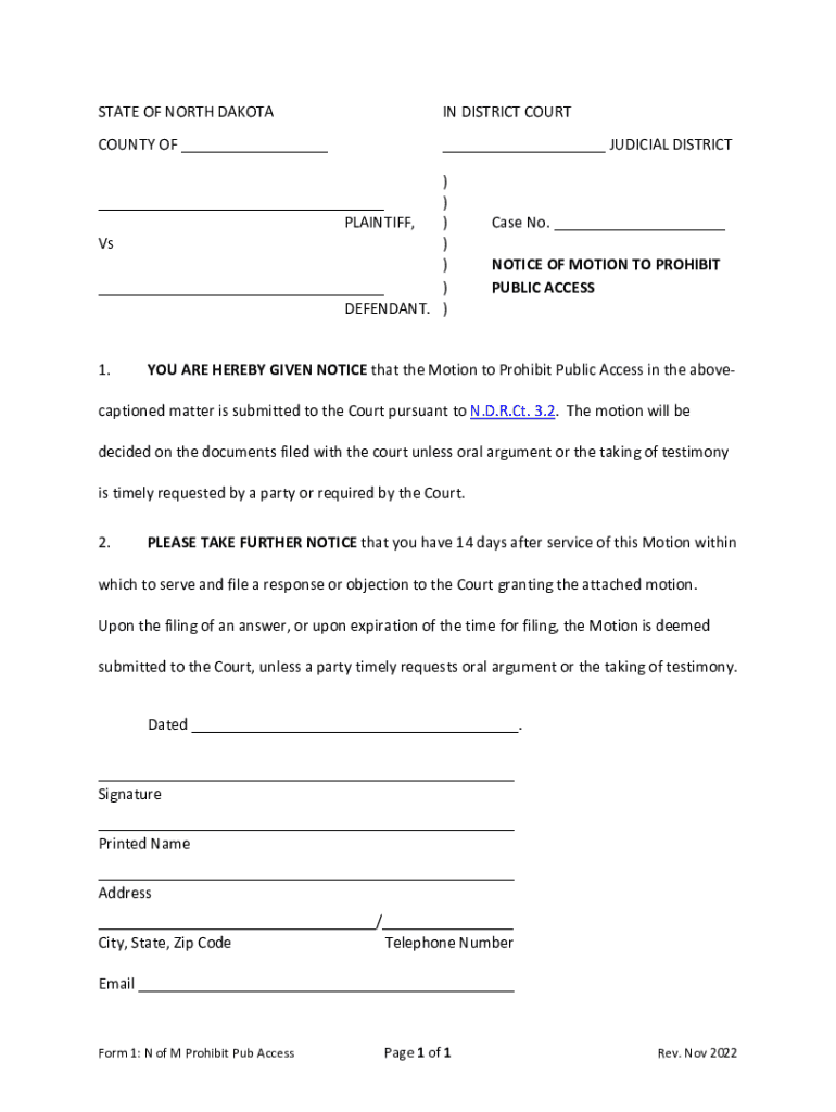 STATE OF NORTH DAKOTAN DISTRICT COURTEOUSLY OF ______ JUDICIAL DISTRICT))))) ___) DEFENDANT. ) ___ PLAINTIFF, Vs1. Case No. ___ NOTICE OF MOTION TO PROHIBIT PUBLIC ACCESSION ARE HEREBY GIVEN NOTICE