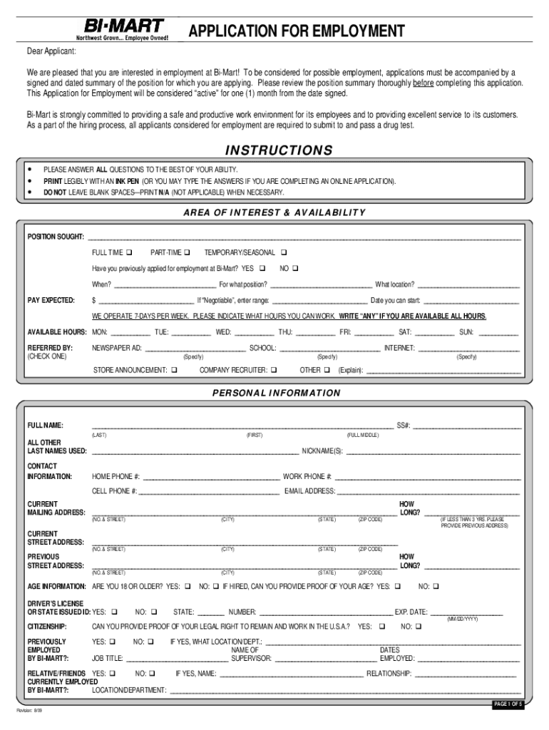 Bi Mart employment application is the form that individuals must fill out to apply for a job at Bi Mart. It includes sections for personal information, work history, and references.