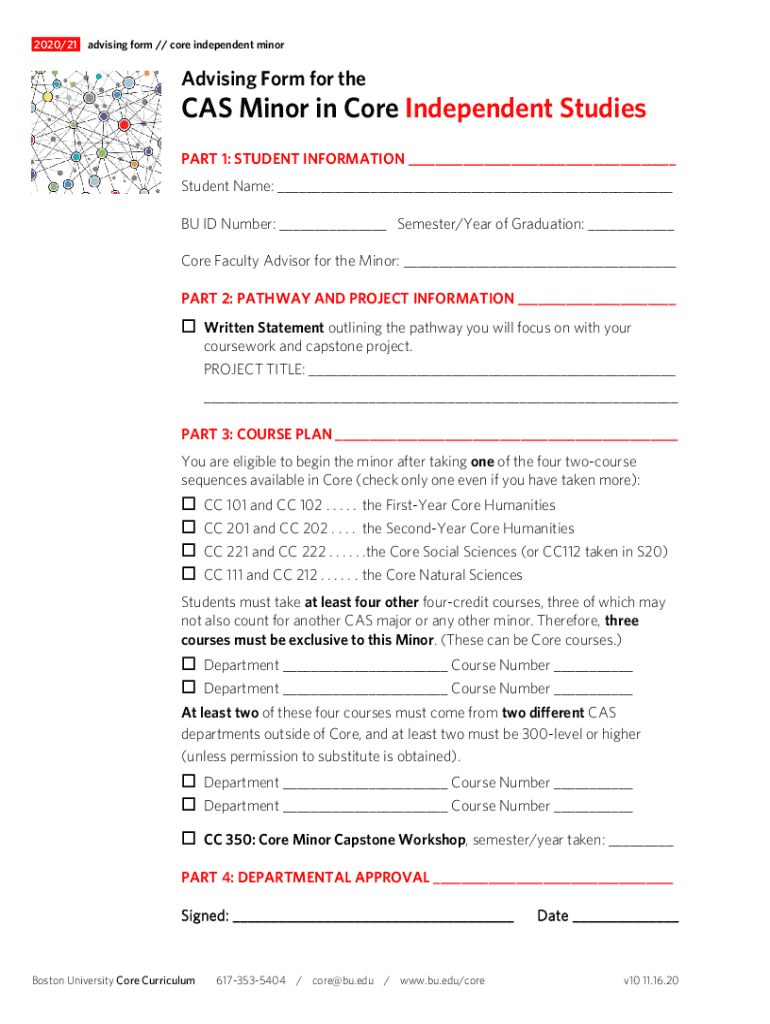 .2020/21. Advising form // core independent misadvising Form for thetas Minor in Core Independent Studies PART 1: STUDENT INFORMATION ___ Student Name: ___ BU ID Number: ___ Semester/Year of Graduation: