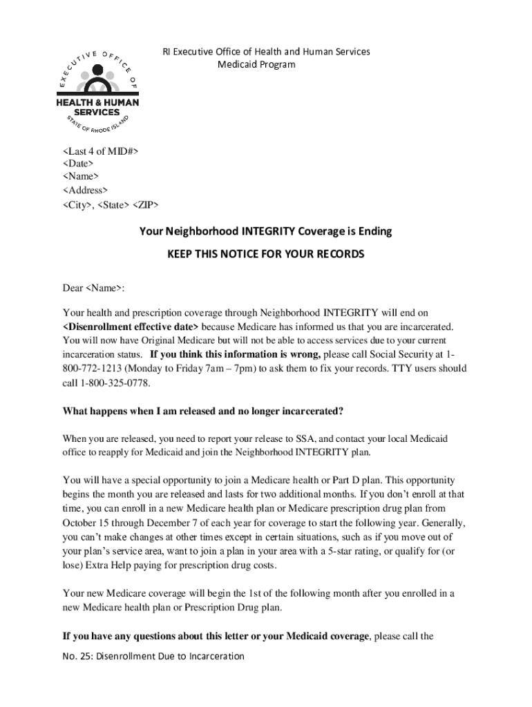 RI Executive Office of Health and Human Services Medicaid Programs 4 of MID# Date Name Address City, State Your Neighborhood INTEGRITY Coverage is Ending KEEP THIS NOTICE FOR YOUR RECORDS Dear Name: