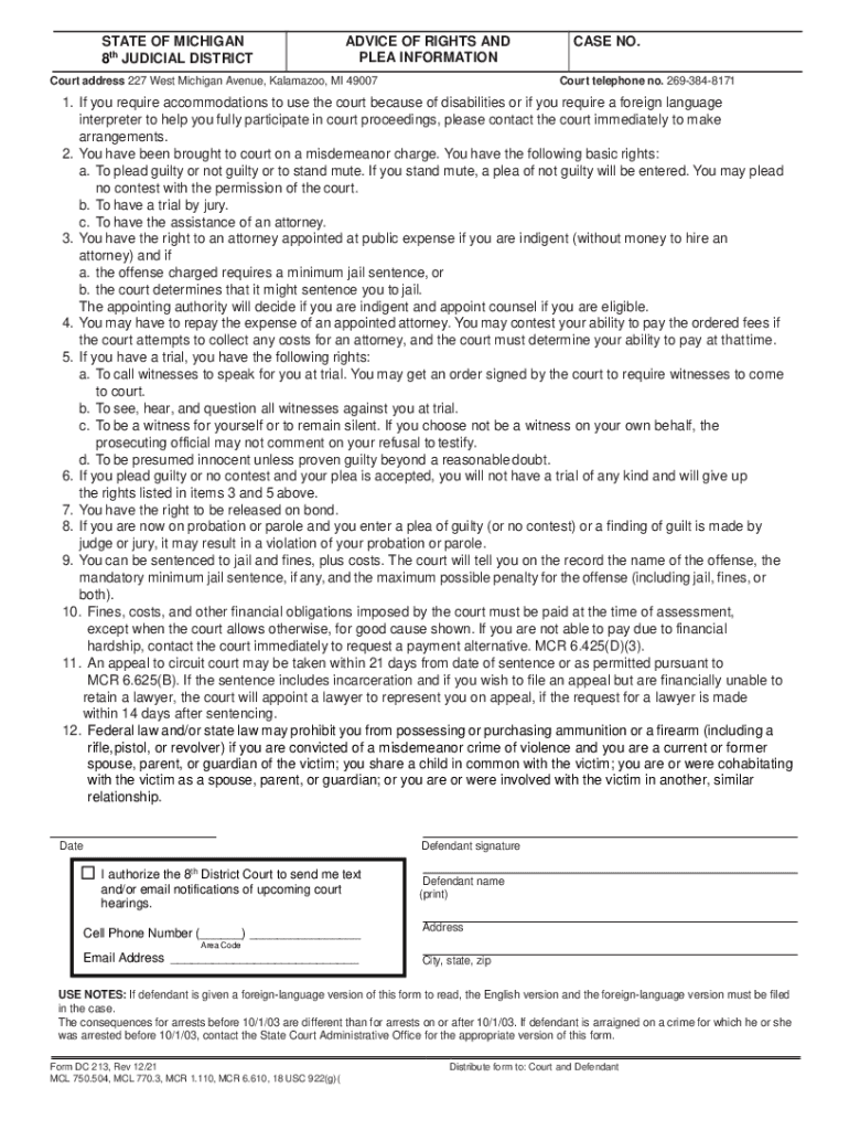 PLEA INFORMATIONCourt address 227 West Michigan Avenue, Kalamazoo, MI 49007CASE NO.