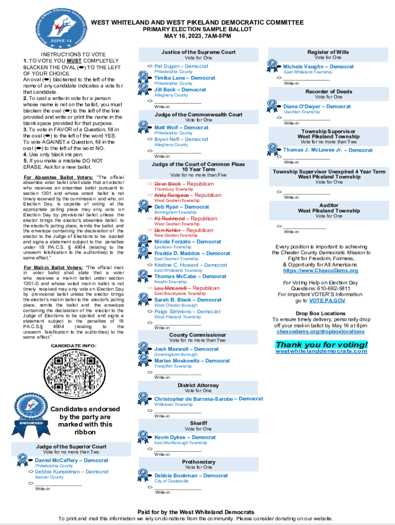 WEST RHINELAND AND WEST IRELAND DEMOCRATIC COMMITTEE PRIMARY ELECTION SAMPLE BALLOT MAY 16, 2023, 7AM8PMINSTRUCTIONS TO VOTE 1. TO VOTE YOU MUST COMPLETELY BLACKEN THE OVAL () TO THE LEFT OF YOUR