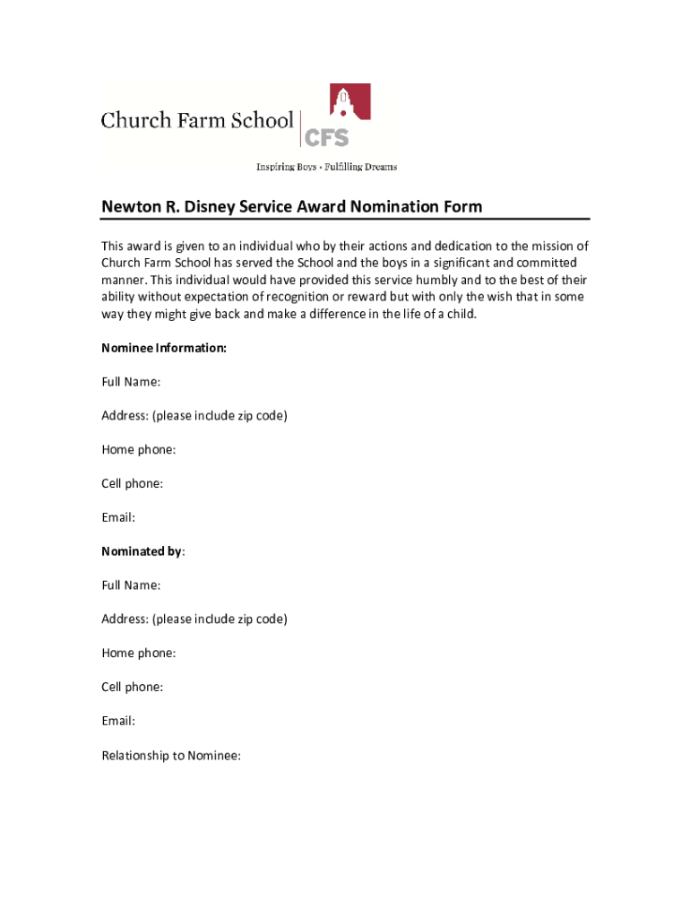 Newton. DisneyServiceAwardNominationForm Thisawardisgiventoanindividualwhobytheiractionsanddedicationtothemissionof ChurchFarmSchoolhasservedtheSchoolandtheboysinasignificantandcommitted manner. Thisindividualwouldhaveprovidedthisservicehumblyandtothebestoftheir