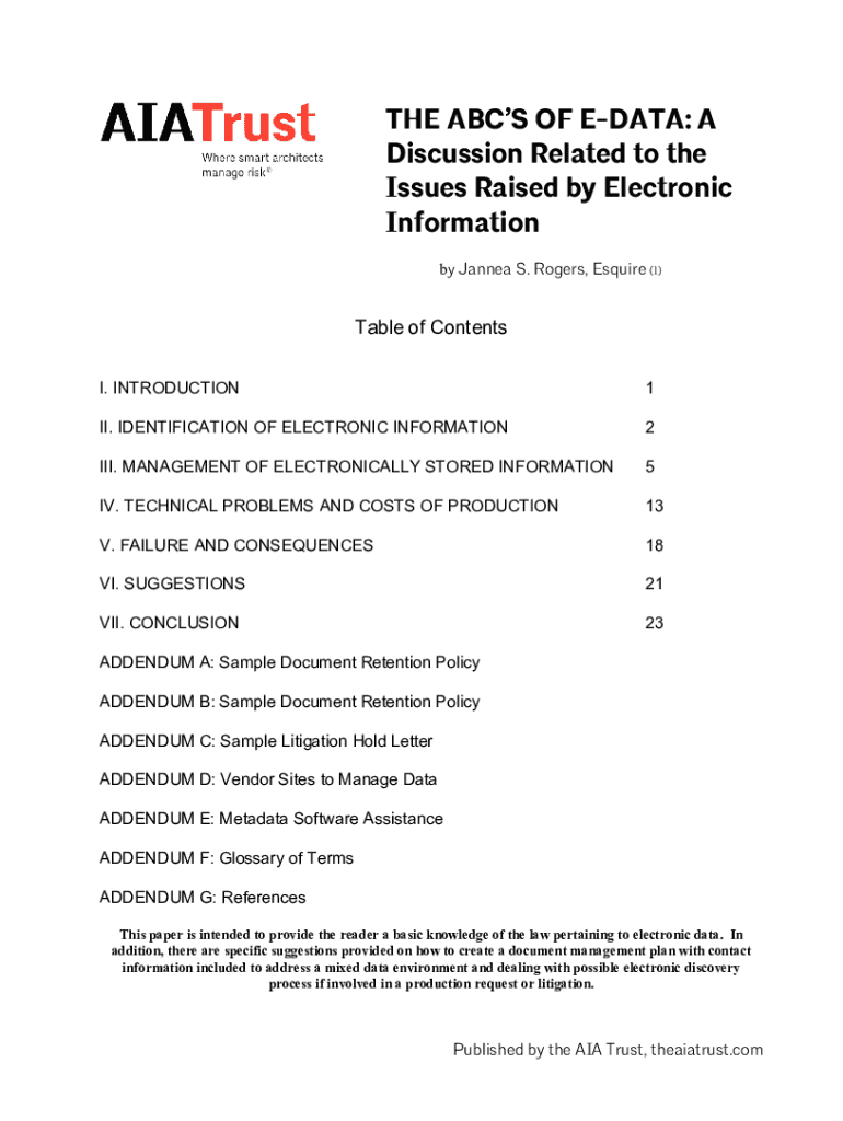 THE ABCs OF DATA: A Discussion Related to the Issues Raised by Electronic Information by Janna S. Rogers, Esquire (1)Table of Contents I. INTRODUCTION1II. IDENTIFICATION OF ELECTRONIC INFORMATION2III.
