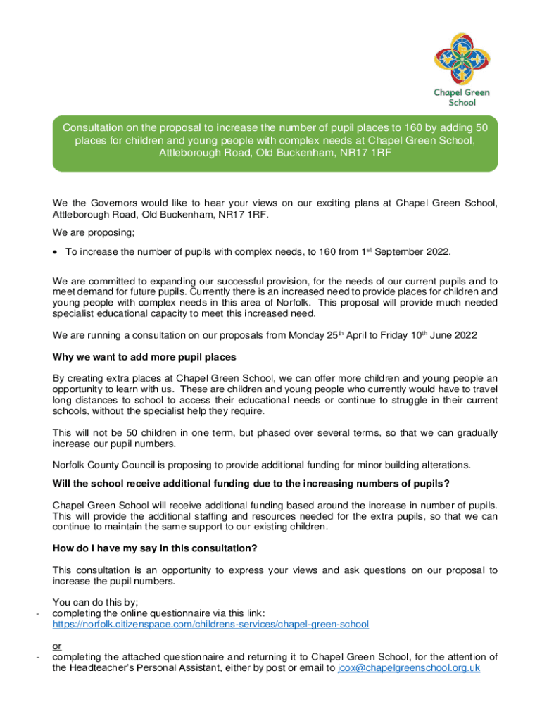 Consultation on the proposal to increase the number of pupil places to 160 by adding 50 places for children and young people with complex needs at Chapel Green School, Attleborough Road, Old Buckingham,