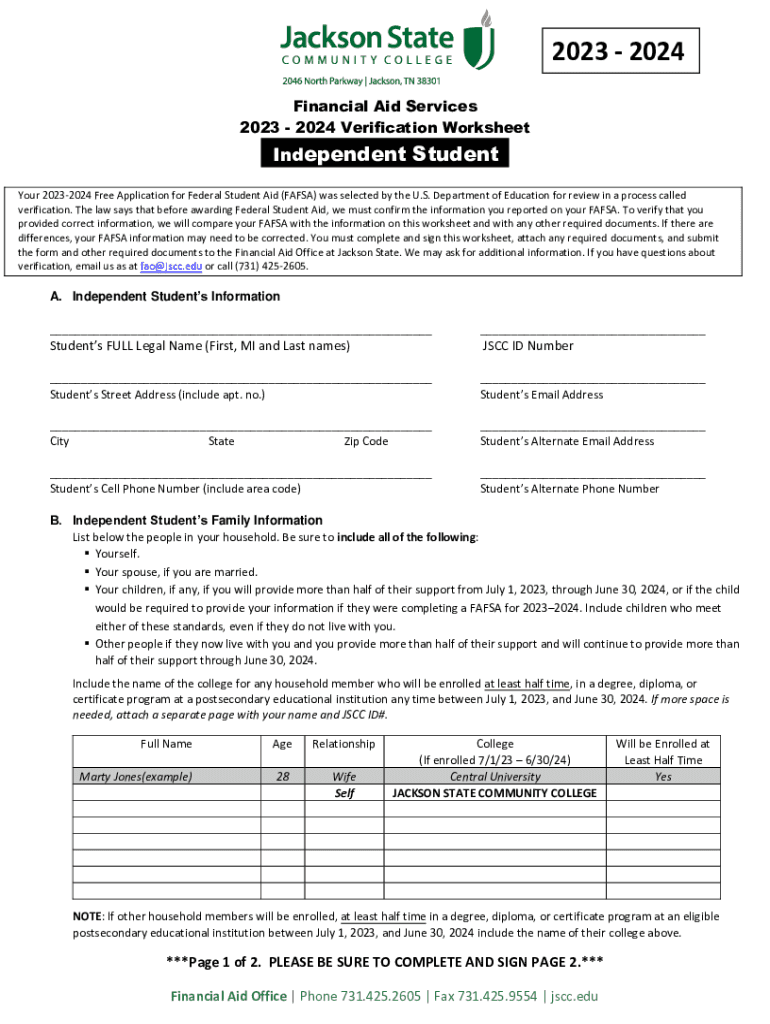 2023 2024 Financial Aid Services 2023 2024 Verification WorksheetIndependent Student i Your 20232024 Free Application for Federal Student Aid (FAFSA) was selected by the U.S. Department of Education