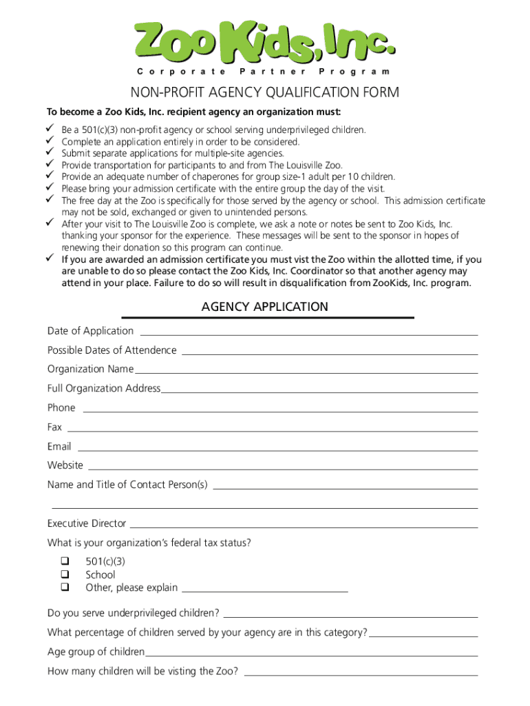 C o r p o r a t EP an r t n e RP r o g r a nonprofit AGENCY QUALIFICATION FORM To become a Zoo Kids, Inc. recipient agency an organization must:99 Be a 501(c)(3) nonprofit agency or school serving