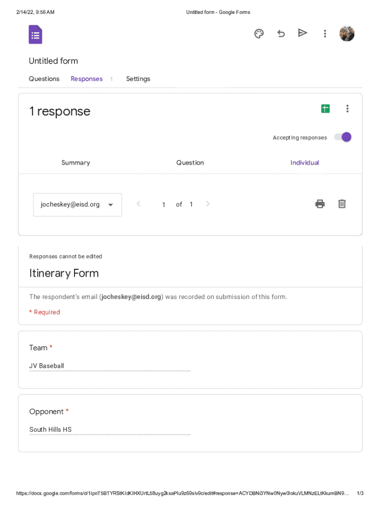 2/14/22, 9:56 Untitled form Google FormsUntitled form QuestionsResponses1Settings1 response Accepting responsesSummaryjocheskey@eisd.orgQuestion1ofIndividual1Responses cannot be editedItinerary Form