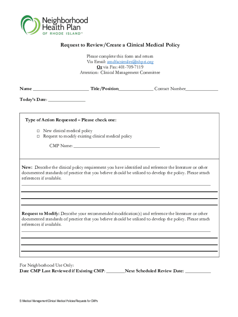 Request to Review/Create a Clinical Medical Policy Please complete this form and return Via Email: amdfacsimiles@nhpri.org Or via Fax: 4017097119 Attention: Clinical Management Committee Name ___