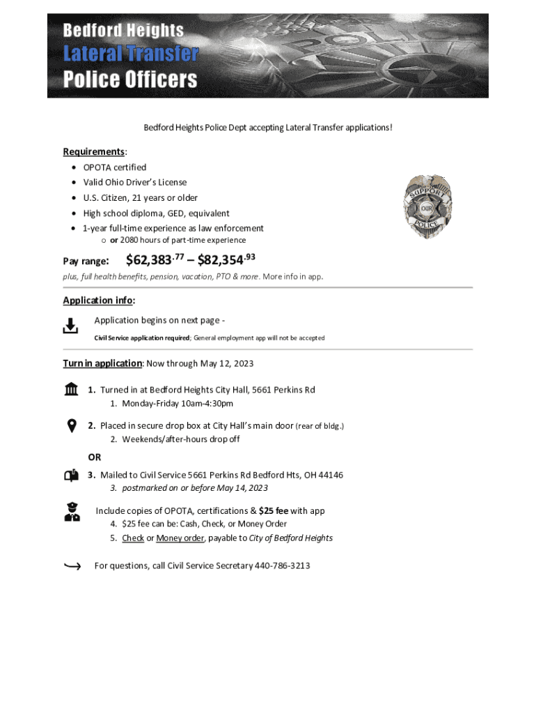 Bedford Heights Police Dept accepting Lateral Transfer applications! Requirements: OPO TA certified Valid Ohio Driver's License U.S. Citizen, 21 years or older High school diploma, GED, equivalent