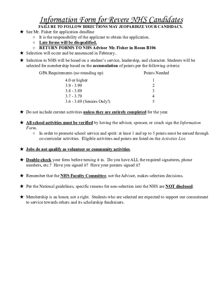 Information Form for Revere NHS CandidatesFAILURE TO FOLLOW DIRECTIONS MAY JEOPARDIZE YOUR CANDIDACY. See Mr. Fisher for application deadline It is the responsibility of the applicant to obtain the