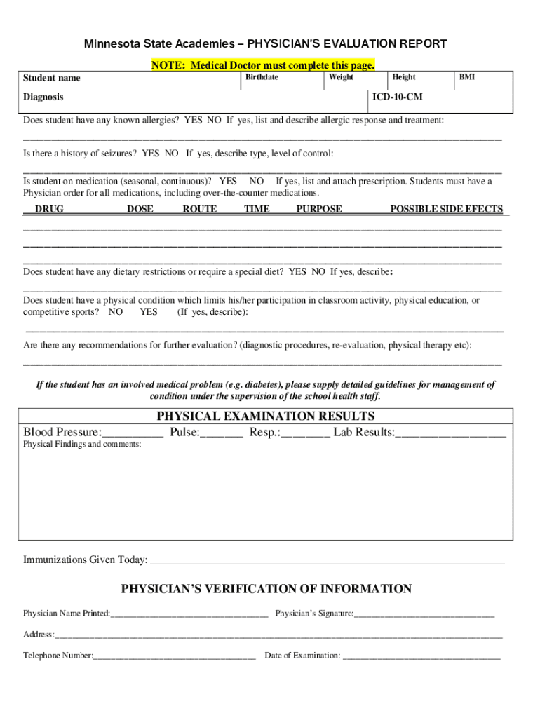 Minnesota State Academies PHYSICIANS EVALUATION REPORT NOTE: Medical Doctor must complete this page. BirthdateStudent nameWeightDiagnosisHeightBMIICD10CMDoes student have any known allergies? YES