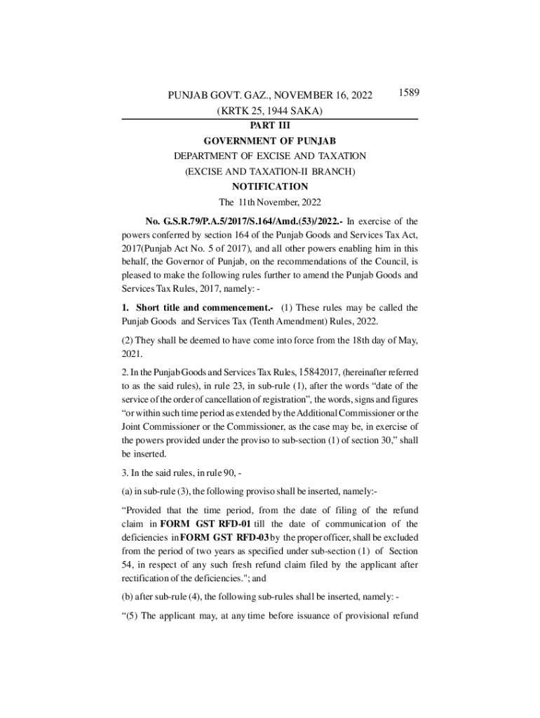 PUNJAB GOVT. GAS., NOVEMBER 16, 2022 (KR TK 25, 1944 AKA)1589PART III GOVERNMENT OF PUNJAB DEPARTMENT OF EXCISE AND TAXATION (EXCISE AND TAXATION BRANCH) NOTIFICATION The 11th November 2022 No. G.S.R.79/P.A.5/2017/S.164/AMD.(53)/2022.