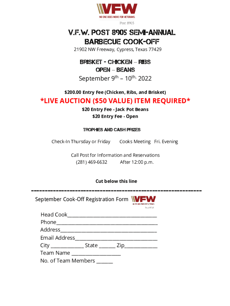 V.F.W. POST 8905 SEMIANNUAL BARBECUE COOKOUT 21902 NW Freeway, Cypress, Texas 77429Brisket Chicken Ribs Open Beans September 9th 10th, $2022200.00 Entry Fee (Chicken, Ribs, and Brisket)*LIVE AUCTION