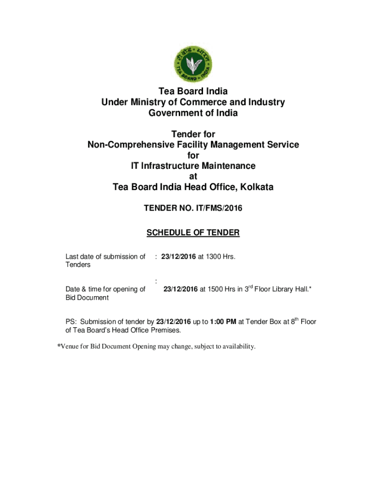 Tea Board India Under Ministry of Commerce and Industry Government of India Tender for Comprehensive Facility Management Service for IT Infrastructure Maintenance at Tea Board India Head Office, Kolkata