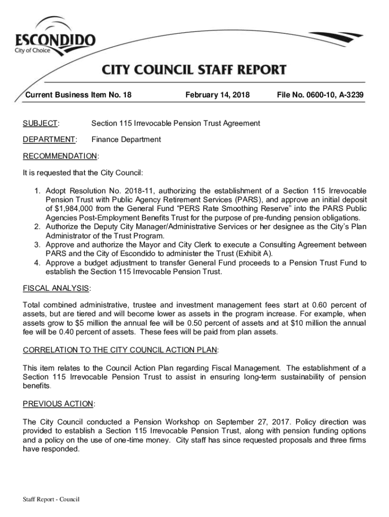 Current Business Item No. 18February 14, 2018SUBJECT:Section 115 Irrevocable Pension Trust AgreementDEPARTMENT:Finance Departmental No. 060010, A3239RECOMMENDATION: It is requested that the City Council: