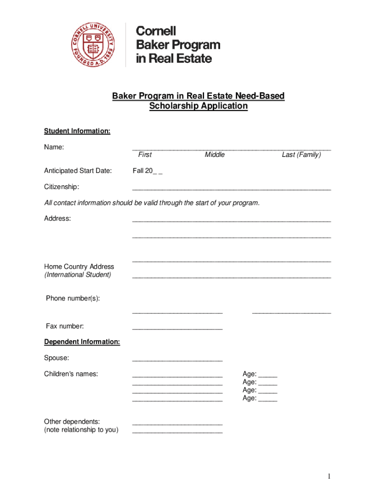 Baker Program in Real Estate Needed Scholarship Application Student Information: Name:___ First Middle Last (Family)Anticipated Start Date:Fall 20_ _Citizenship:___All contact information should be