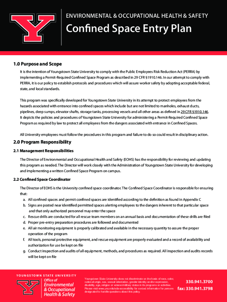 ENVIRONMENTAL & OCCUPATIONAL HEALTH & SAFETYConfined Space Entry Plan 1.0 Purpose and Scope It is the intention of Youngstown State University to comply with the Public Employees Risk Reduction Act