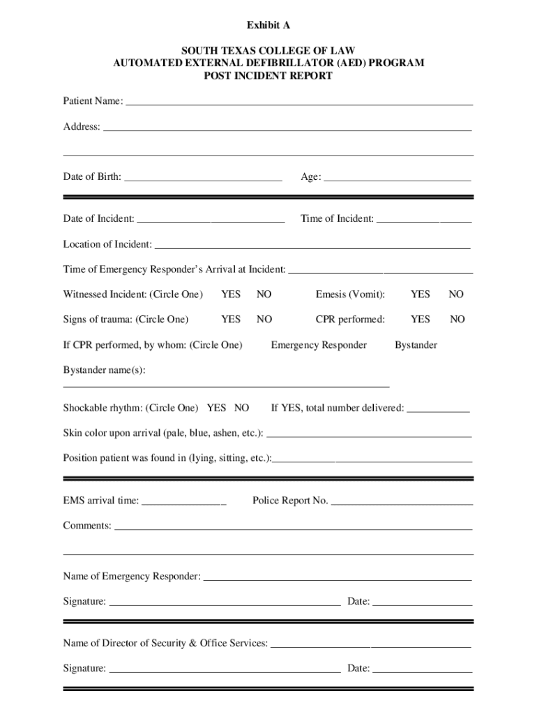 Exhibit A SOUTH TEXAS COLLEGE OF LAW AUTOMATED EXTERNAL DEFIBRILLATOR (AED) PROGRAM POST INCIDENT REPORT Patient Name: ___ Address: ___ ___ Date of Birth: ___Age: ___Date of Incident: ___Time of Incident: