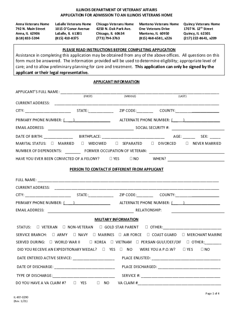 ILLINOIS DEPARTMENT OF VETERANS AFFAIRS APPLICATION FOR ADMISSION TO AN ILLINOIS VETERANS HOME Anna Veterans Home 792 N. Main Street Anna, IL 62906 (618) 8335394LaSalle Veterans Home 1015 O'Conor