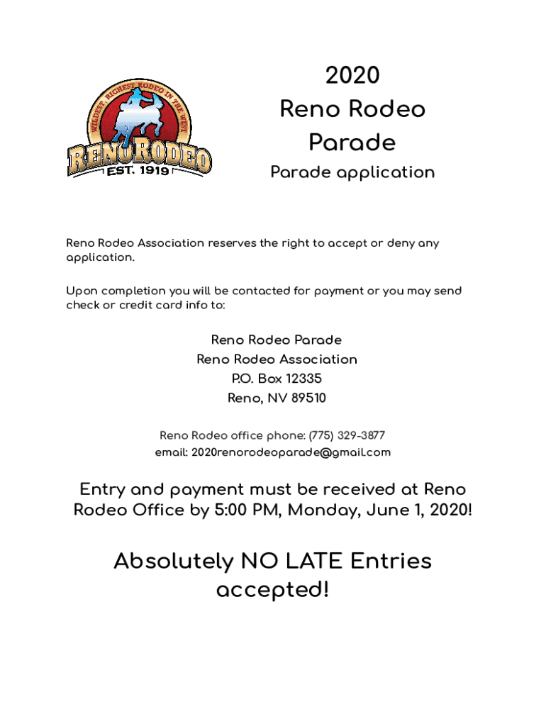 2020 Reno Rodeo Parade application Reno Rodeo Association reserves the right to accept or deny any application. Upon completion, you will be contacted for payment, or you may send check or credit