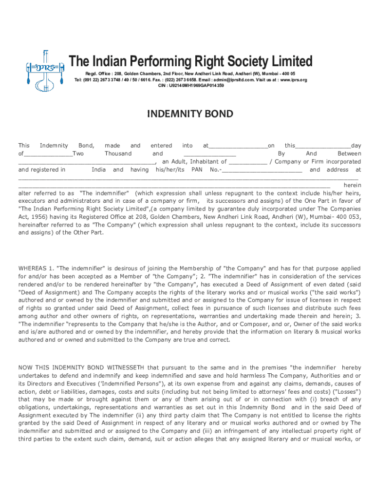 The Indian Performing Right Society Limited Red. Office : 208, Golden Chambers, 2nd Floor, New Adhere Link Road, Adhere (W), Mumbai 400 05 Tel: (091 22) 2673 3748 / 49 / 50 / 6616. Fax. : (022) 2673