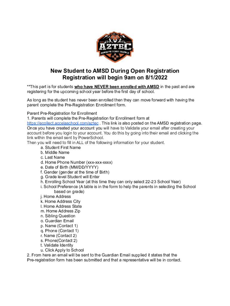 With pdfFiller, you may easily complete and sign new student to amsd online. It lets you modify original PDF material, highlight, blackout, erase, and write text anywhere on a page, legally eSign your document, and do a lot more. Create a free account to handle professional papers online.