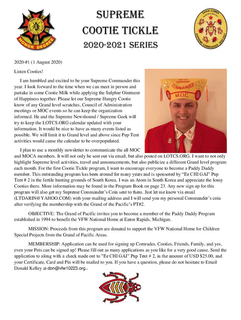 Supreme Cootie Tickle 20202021 Series 2020#1 (1 August 2020) Listen Cooties! I am humbled and excited to be your Supreme Commander this year. I look forward to the time when we can meet in person
