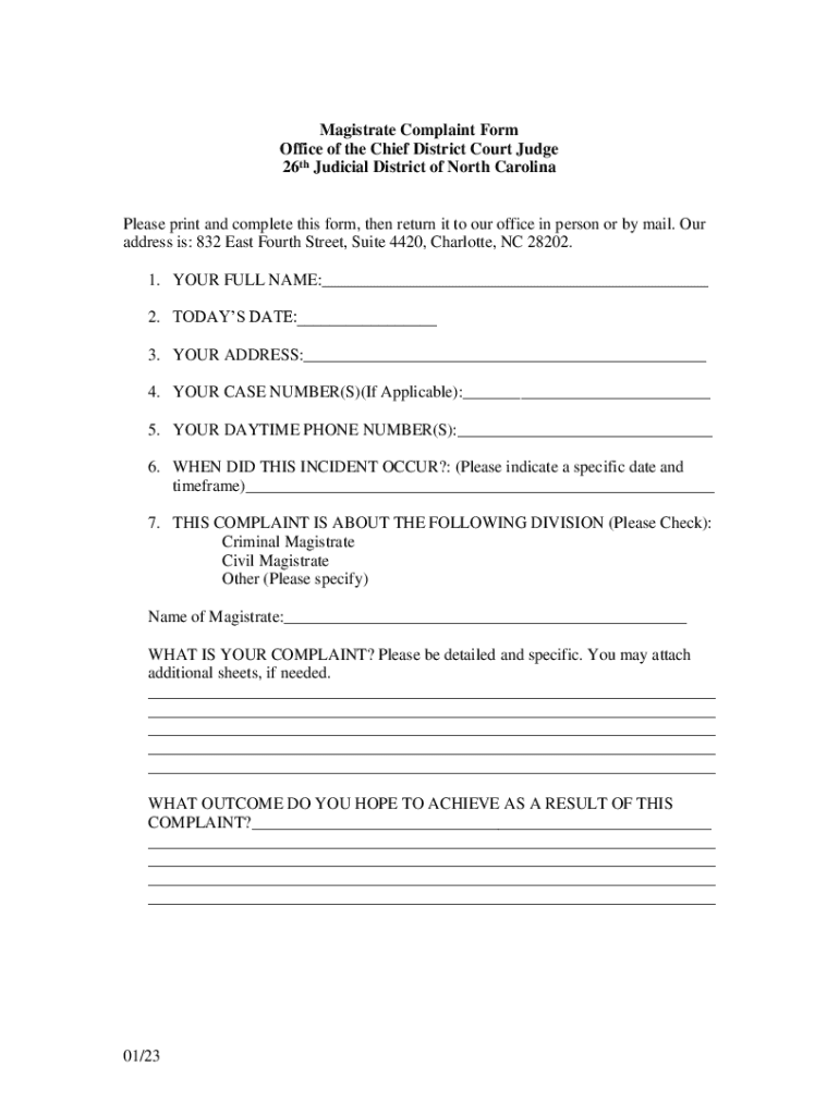 Complaint and Resolution Procedures Magistrates of the 26th Judicial District of North Carolina The Chief District Court Judge thanks you for taking the time to inform us of your complaint regarding