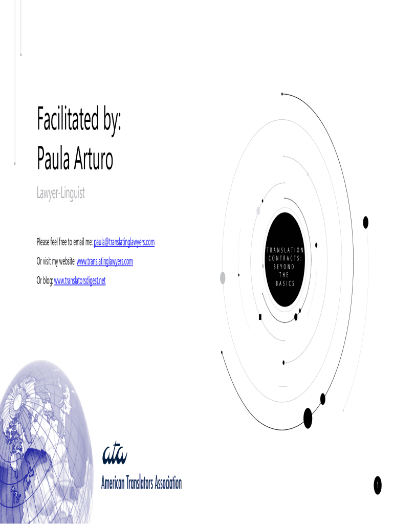 Facilitated by: Paula Arturo LawyerLinguist Please feel free to email me: paula@translatinglawyers.com Or visit my website: www.translatinglawyers.com Or blog: www.translatorsdigest.net1The information