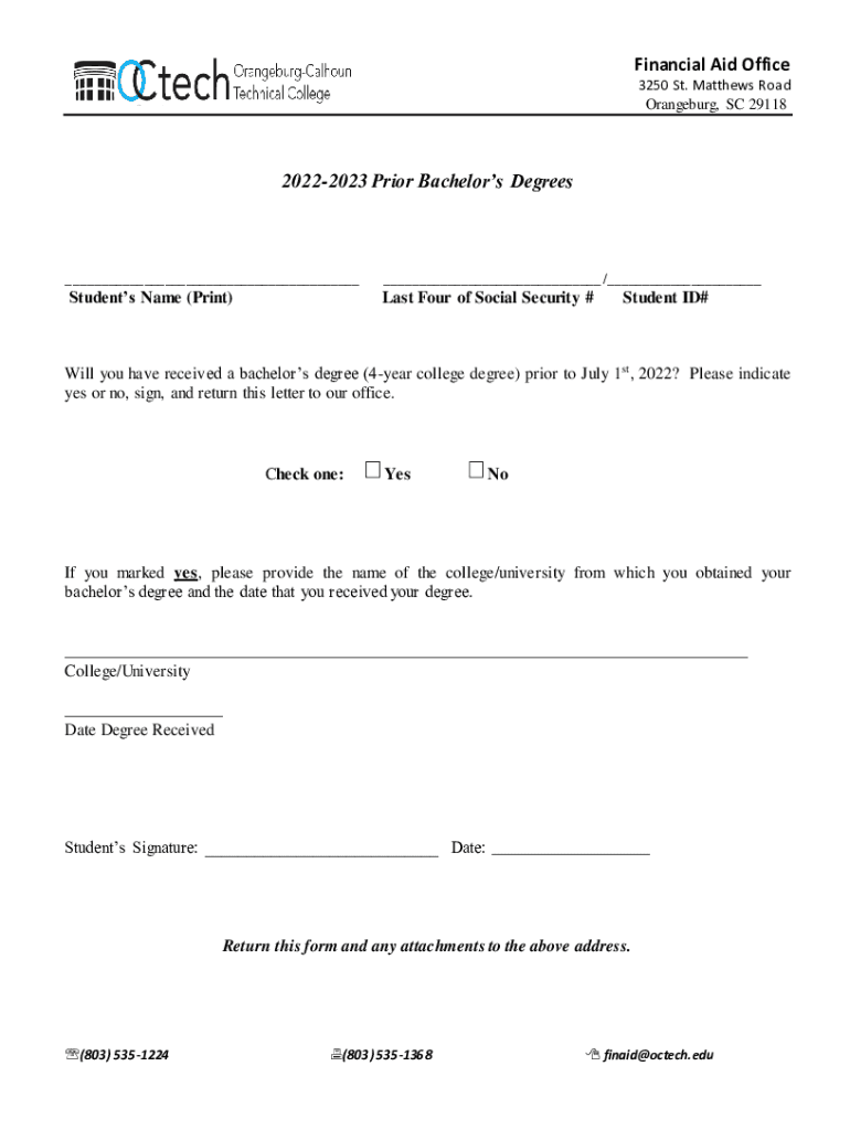 Financial Aid Office 3250 St. Matthews Road Orange burg, SC 2911820222023 Prior Bachelors Degrees______ /___Students Name (Print)Last Four of Social Security #Student ID#Will you have received a bachelors