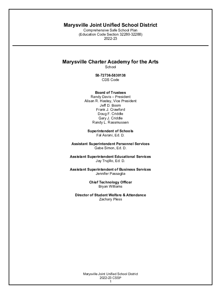 Marysville Joint Unified School District Comprehensive Safe School Plan (Education Code Section 3228032288) 202223Marysville Charter Academy for the Arts School 58727365830138 CDS Code Board of Trustees