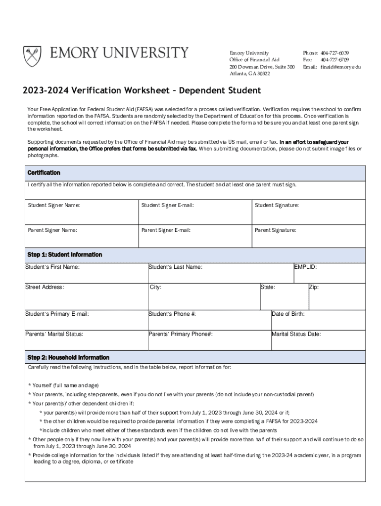Emory University Office of Financial Aid 200 Bowman Drive, Suite 300 Atlanta, GA 30322Phone: 4047276039 Fax: 4047276709 Email: finaid@emory.edu20232024 Verification Worksheet Dependent Student Your