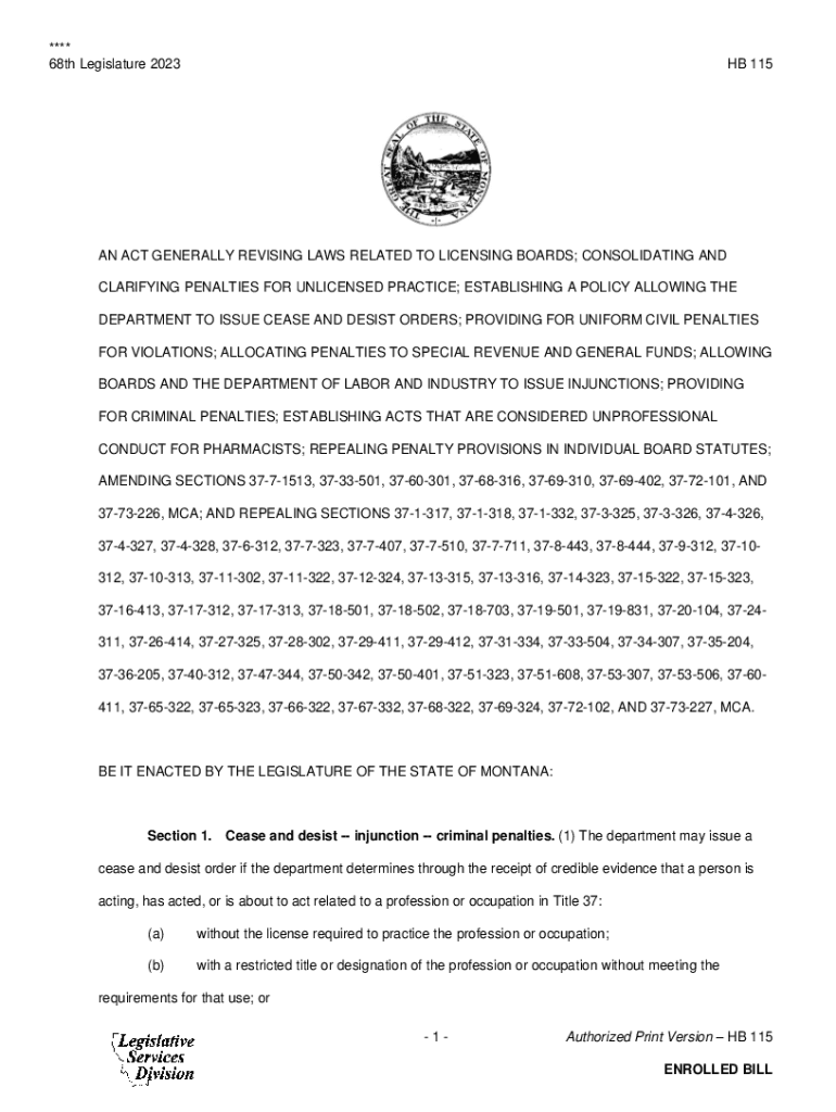 **** 68th Legislature 2023HB 115AN ACT GENERALLY REVISING LAWS RELATED TO LICENSING BOARDS; CONSOLIDATING AND CLARIFYING PENALTIES FOR UNLICENSED PRACTICE; ESTABLISHING A POLICY ALLOWING THE DEPARTMENT