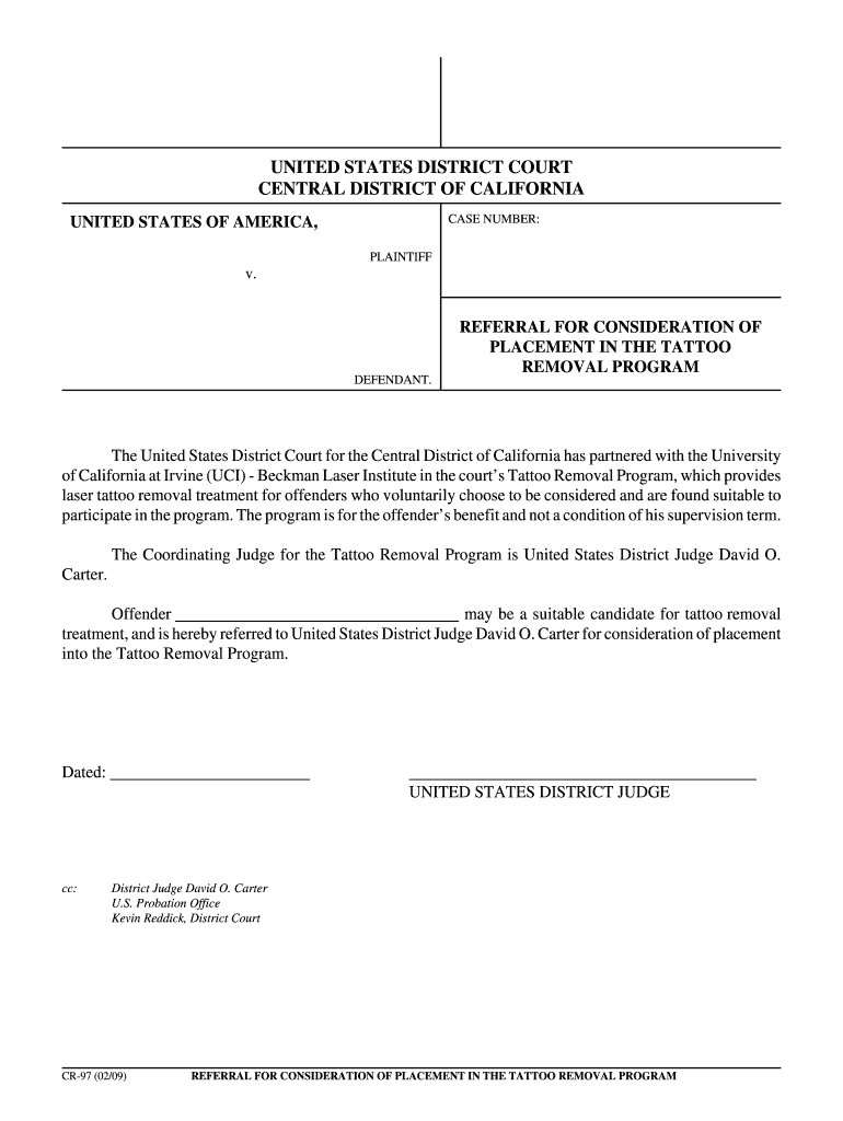 UNITED STATES DISTRICT COURT CENTRAL DISTRICT OF CALIFORNIA CASE NUMBER: UNITED STATES OF AMERICA, PLAINTIFF v. DEFENDANT. REFERRAL FOR CONSIDERATION OF PLACEMENT IN THE TATTOO REMOVAL PROGRAM The