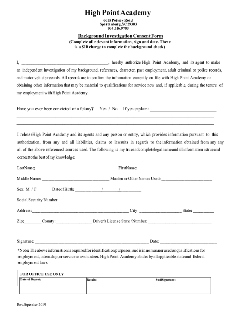 High Point A academy 6655 Pottery Road Spartanburg, S C 29303 864.316.9788Background Investigation Consent Form(Complete all relevant information, sign and date. There is a $10 charge to complete