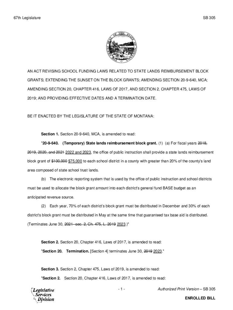 67th Legislatures 305AN ACT REVISING SCHOOL FUNDING LAWS RELATED TO STATE LANDS REIMBURSEMENT BLOCK GRANTS; EXTENDING THE SUNSET ON THE BLOCK GRANTS; AMENDING SECTION 209640, MCA; AMENDING SECTION