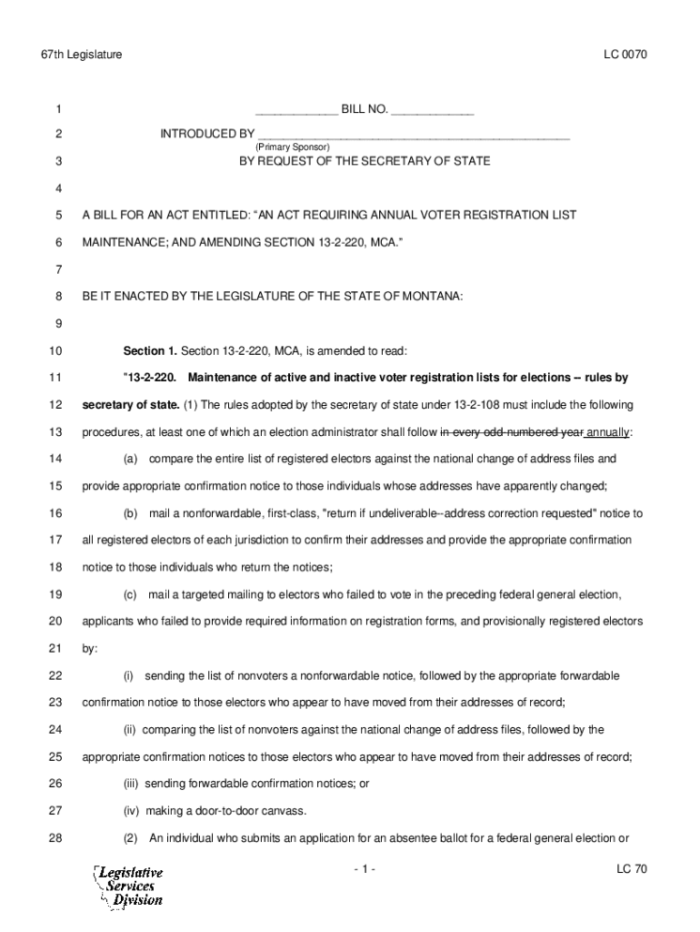 67th Legislature LC 00701___ BILL NO. ___2INTRODUCED BY ___ (Primary Sponsor)3BY REQUEST OF THE SECRETARY OF STATE4 5A BILL FOR AN ACT ENTITLED: AN ACT REQUIRING ANNUAL VOTER REGISTRATION LIST6MAINTENANCE;