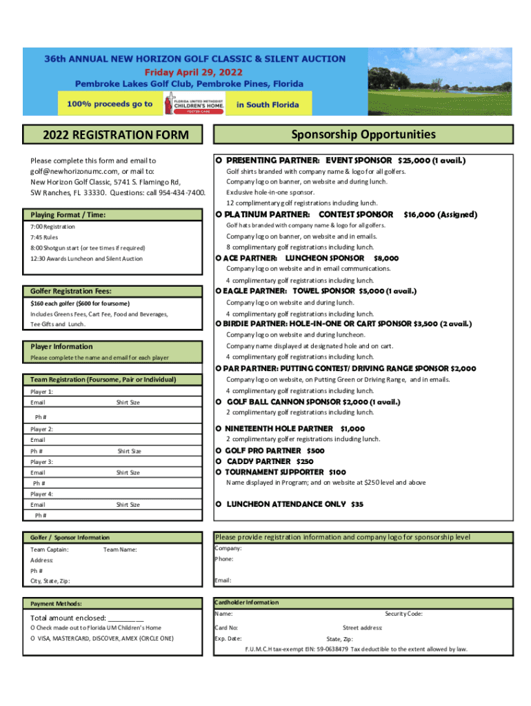 Sponsorship Opportunities2022 REGISTRATION FORM Please complete this form and email to golf@newhorizonumc.com, or mail to: New Horizon Golf Classic, 5741 S. Flamingo Rd, SW Ranches, FL 33330. Questions: