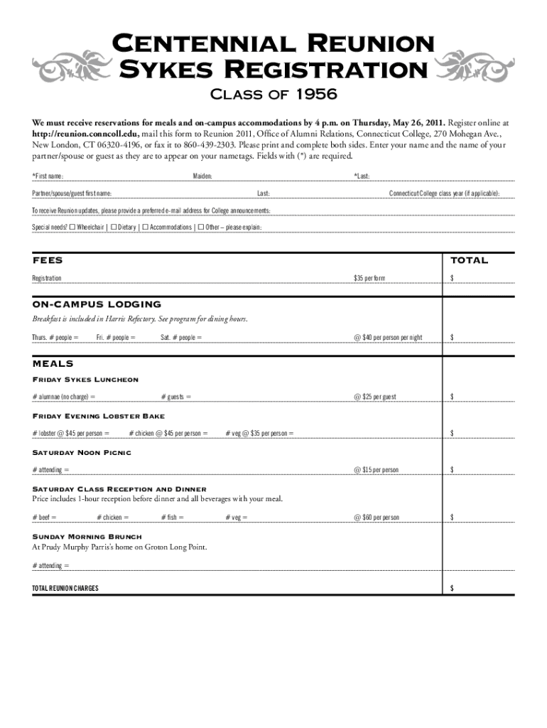 Centennial Reunion Sykes Registration Class of 1956We must receive reservations for meals and on campus accommodations by 4 p.m. on Thursday, May 26, 2011. Register online at http://reunion.conncoll.edu,