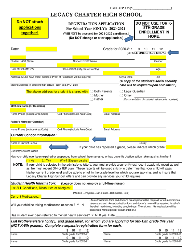 LCS Use Only (___)LEGACY CHARTER HIGH SCHOOL Do NOT attach applications together!REGISTRATION APPLICATION For School Year (ONLY): 20202021 (Will NOT be accepted for 20212022 enrollment.) (Do NOT change