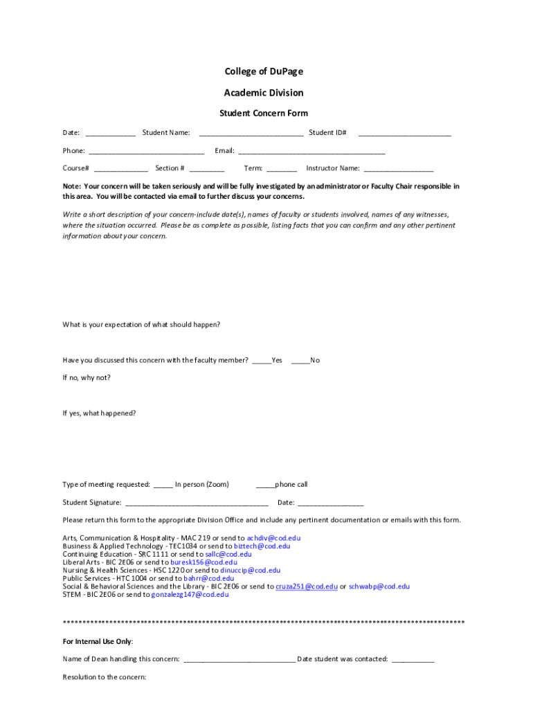 College of Dupage Academic Division Student Concern Form Date: ___ Student Name:___ Student ID#Phone: ______Email: ___Course# ___ Section # ___Term: ___Instructor Name: ___Note: Your concern will